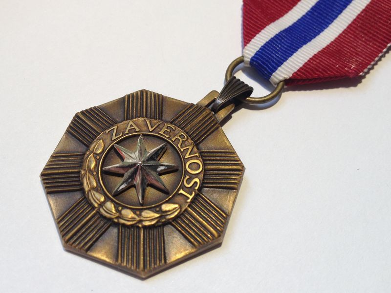 Medaile Policie České republiky a Hasičského záchranného sboru České republiky Medaile „Za věrnost“ Medaile „Za věrnost“ je zhotovena z tombakové slitiny v provedení starobronz. Má tvar pravidelného osmiúhelníku o průměru opsané kružnice 35 mm a tloušťku 3 mm. Na lícové straně je v kruhovém poli uprostřed plastických pruhů hvězdicového typu umístěna reliéfní osmicípá hvězdice.