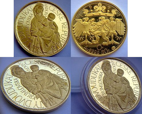 ČR – 2dukát 1997 Madona Krumlovská P.HorákZlato – 24kt – 999,9 / 1000váha – 7,778g – 1/4 oz (trojské unce)průměr – 23mm, Etue23.11.2008 Aukce Kroměříř docílená cena : 9.000,-Kč