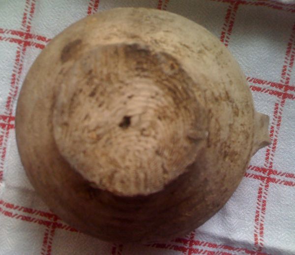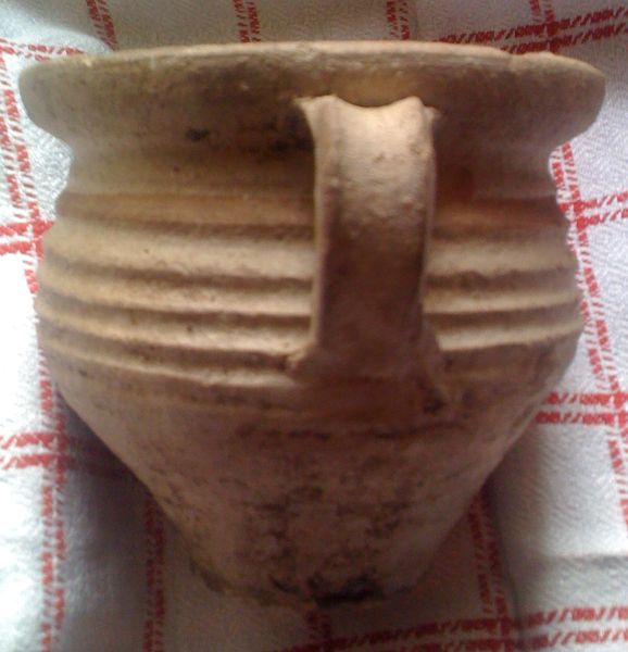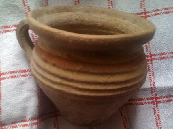 Středověké nádoby 13.století. Severní Čechy. Středověká keramika. Menší džbánek výška 9cm, průměr 10cm