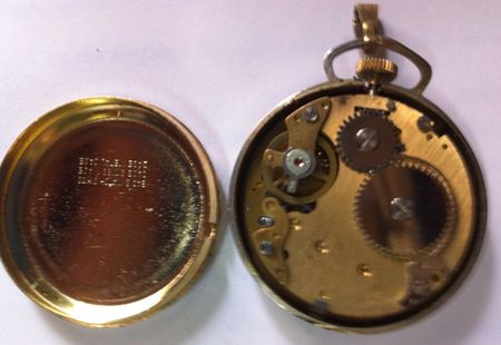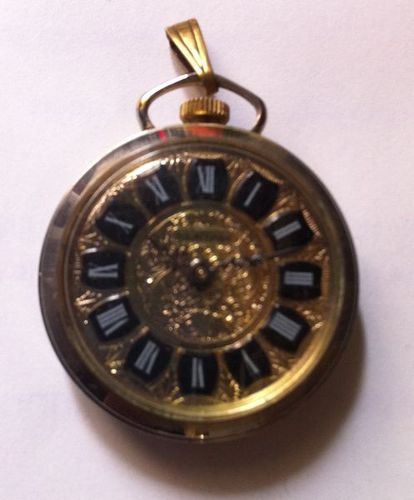 Malé kapesní hodinky. Obecný kov, číselník gravŕovaný, Čísla bílá na onyxu. Mechanické