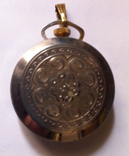 Malé kapesní hodinky. Obecný kov, číselník gravŕovaný, Čísla bílá na onyxu.