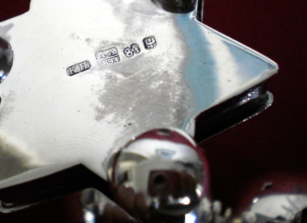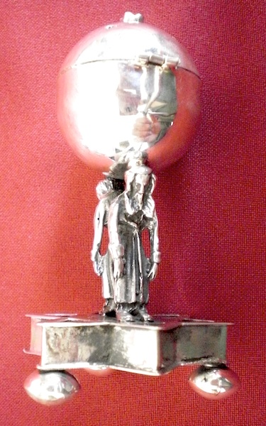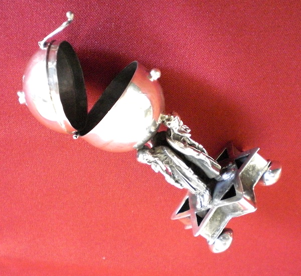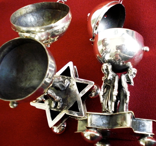 Stříbrné kořenky s postavičkami a židovskou hvězdou. Židovské kořenky pro slavnostní zahájení soboty, na šábes. Stříbro Ag ruský punc 84. Kořenka sloužila a slouží pro uložení koření jehož aroma má připomínat vůni domova Israele. Židovská keřenka, židovské kořenky stříbrné, zidovske korenicky v striebre. Kořenky jsou velice hezky vyvedené s množstvým plastických obrazců