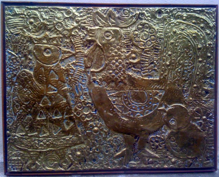 Uchytilova Hampl 1969 Kohoutek a slepicka. Obraz tepany do plechu. Signováno na rámu dva podpisy a letopočet 1969 Rozměry: 47*37cm