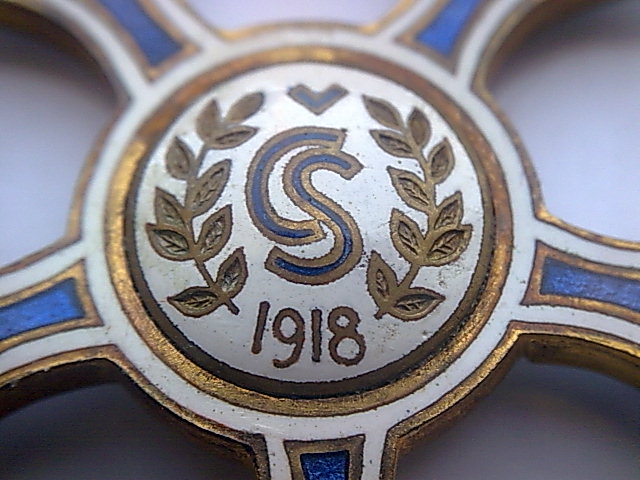 První verze s největší pravděpodobností měla zapínání, zavěšování na podélnou spínací jehlu, která byla na ráhnu a z přední strany měla zakončené polokoule. Další vydání již bylo jen s tenkrát obvyklou jehlou z drátu tvarovanou do T, se zapichívání zhora dolu. Později se zase objevuje ráhno.